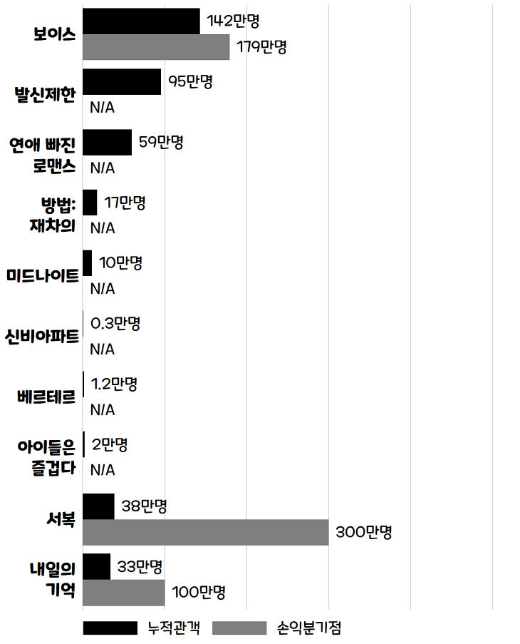 그런데, 금년 한 해에 전년대비 약 43%감소한 436만명의 관객수를 기록했습니다. 모가디쉬가 올해 개봉한 한국 영화 중 유일하게 300만 명 이상의 관객수를 기록했지만 손익분기점도 꽤 컸기 때문에 별다른 이득을 보지 못했습니다. <기적>은 손익 분기점의 약 48% 달성에 그치고 있습니다. 그래도 대다수의 다른 제작사에 비하면 상대적으로 사정이 좋을 것 같은 롯데이긴 해요.