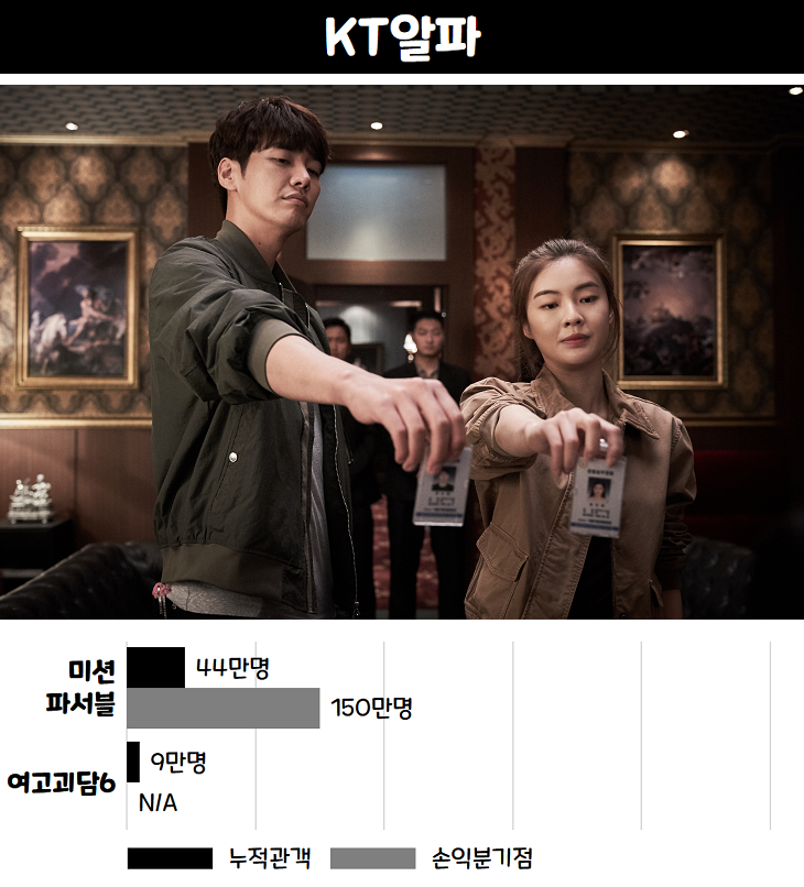 T의 자회사 KT알파는 설 연휴 직후 공개된 <미션파서블>이 손익분기점의 약 30%에 그쳤고, <여고괴담>시리즈의 12년 만의 후속작 <여고괴담 여섯 번째 이야기:모교> 역시 10만명도 안되는 관객수를 기록하는데 그쳤습니다.
