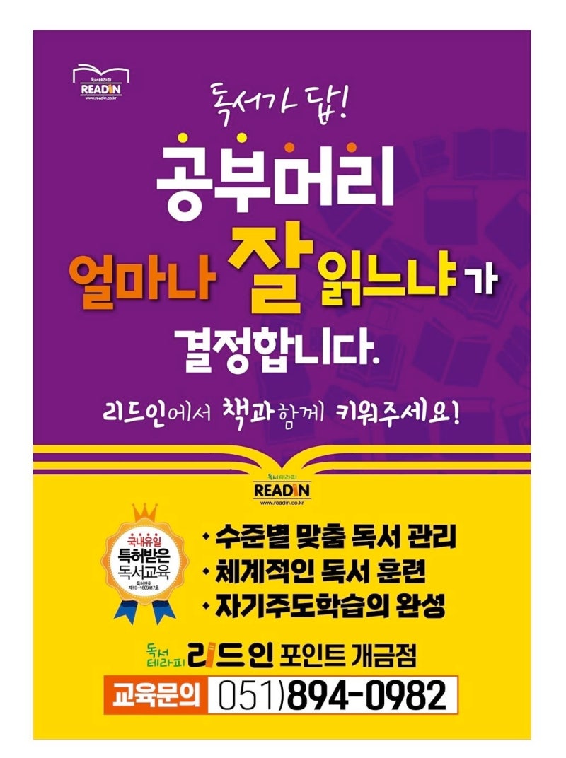 영어를 제외한 모든 교육이 한글이고 그래서 더 국어의 중요성도 다시 한번 생각했고, 포이트 정석학원 개금점에서의 수업은 학생들의 교육에 큰 도움이 될 것이라는 개인적인 생각을 해보면서 독서의 기본 능력인 문장력 이해와 속독과 정독으로 성인이 되어서도 독서 및 살면서 더 나은 글에 대한 이해와 표현력이 향상되지 않을까 생각합니다.
