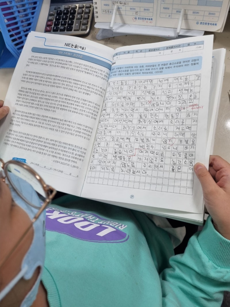 학생들이 글을 쓰는 동안에도 원장님께서 일일이 학생들이 쓴 글을 체크해주시고, 학생들 역시 익숙한 수업인지 질문도 없이 자연스럽게 글을 쓰는 수업을 하고 있었고, 우리 때도 가끔 신문 스크랩 숙제를 했던 기억이 떠올라 단순한 노트에 신문을 오려 간단한 설명만 썼던 기억이 떠올랐습니다. ^^