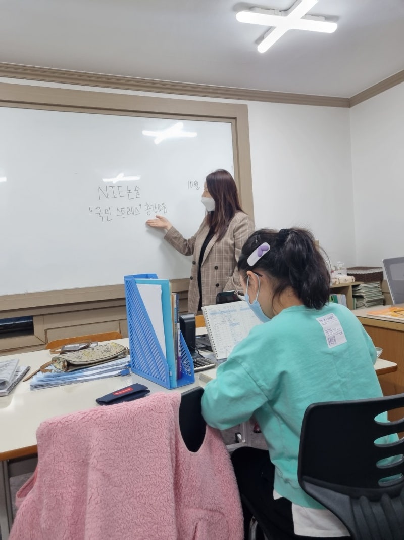 먼저 가야동 논술학원 글쓰기 수업 참관을 큰딸과 함께 사전에 원장님의 허락을 받고 입실하였습니다. 원장님의 직강으로 직접 수업을 주도해 주셔서 무엇보다 유익한 수업 참관으로 다시 한번 감사드립니다. 먼저 NIE 논술 수업에서 최근 뉴스나 언론에 화제가 되고 있는 내용을 숙지하고 글쓰기를 하는 수업이었습니다.