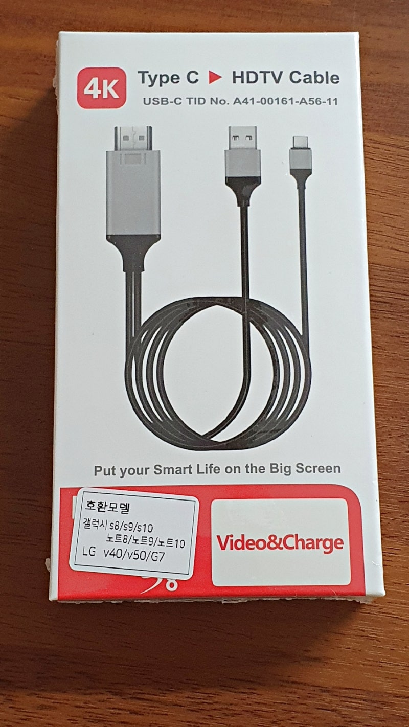 패키징 박스는 정사각형 골판지입니다. USB Type-CTO HDMI 케이블입니다. 보통 미러링 케이블은 휴대전화에서 충전이나 데이터용으로 사용하는 포트에 케이블을 꽂고 모니터나 TV 등 HDMI 포트에 연결합니다.