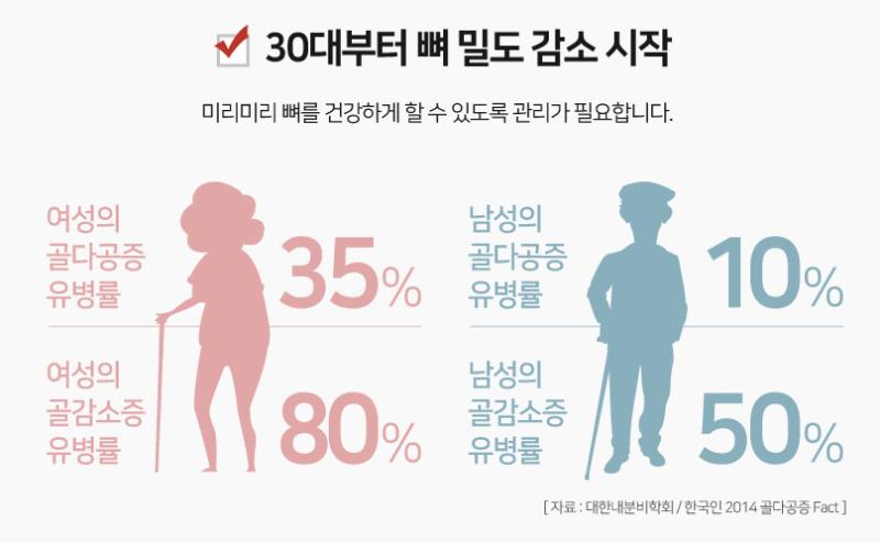 우리 몸의 골격을 구성하는 뼈 건강은 남성보다 근육량이 적은 여성분들이 신경써야 할 부분입니다. 그렇기 때문에 골다공증을 예방하기 위해서는 뼈와 관련된 모든 건강관리에 신경을 써야겠다는 생각이 들었습니다. 골다공증이란 뼈에 구멍이 뚫려 뼈를 약화시키는 질환을 말합니다.뼈의 무기질이 빠져나가 뼈의 골밀도가 감소하여 강도가 약하고 부러지기 쉬운 골절이 일어나는 증상을 말합니다.