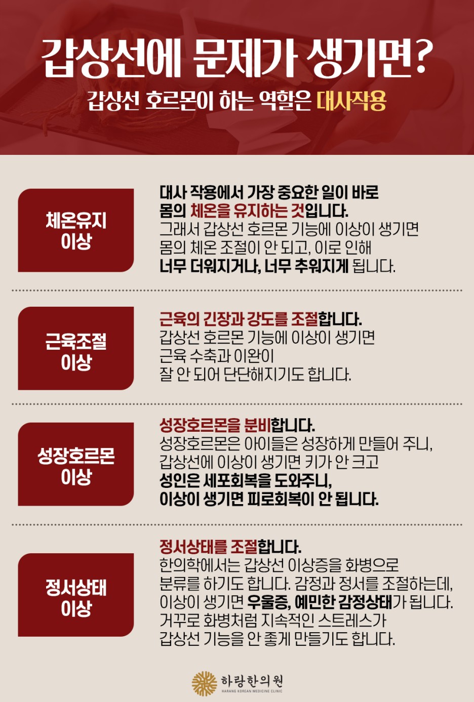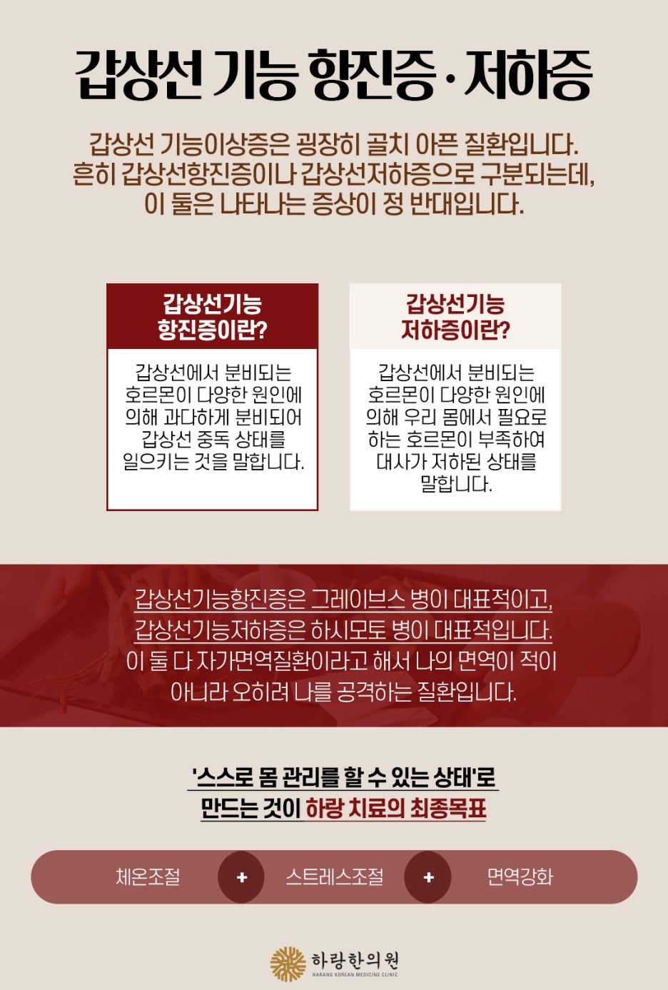 즉 한방에서는 몸의 내부와 외부를 동시에 다스려 우리 몸의 대사와 체온을 조절하고 면역을 끌어올려 갑상선이 스스로 다시 잘 작동할 수 있는 치료를 통해 건강을 지키고 있습니다.