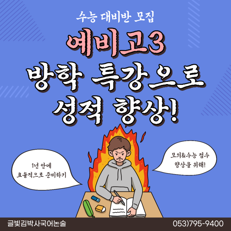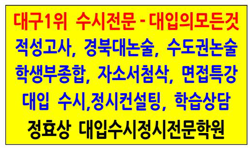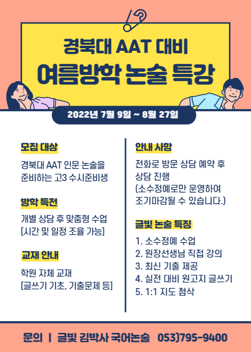 2023학년도 경북대학교 논술시험은 11월 26일 토요일로 예정되어 있습니다. 수능은 11월 17일 목요일이고 수능이 끝난 후 준비하면 8일 정도의 시간만 남습니다. 굴빛에서는 여름방학 특강을 통해 경북대학교 AAT의 기본부터 실전까지 정복할 수 있습니다. 자세한 사항은 학원으로 문의해주세요. 감사합니다。(문자메시지☞010-7177-7144)