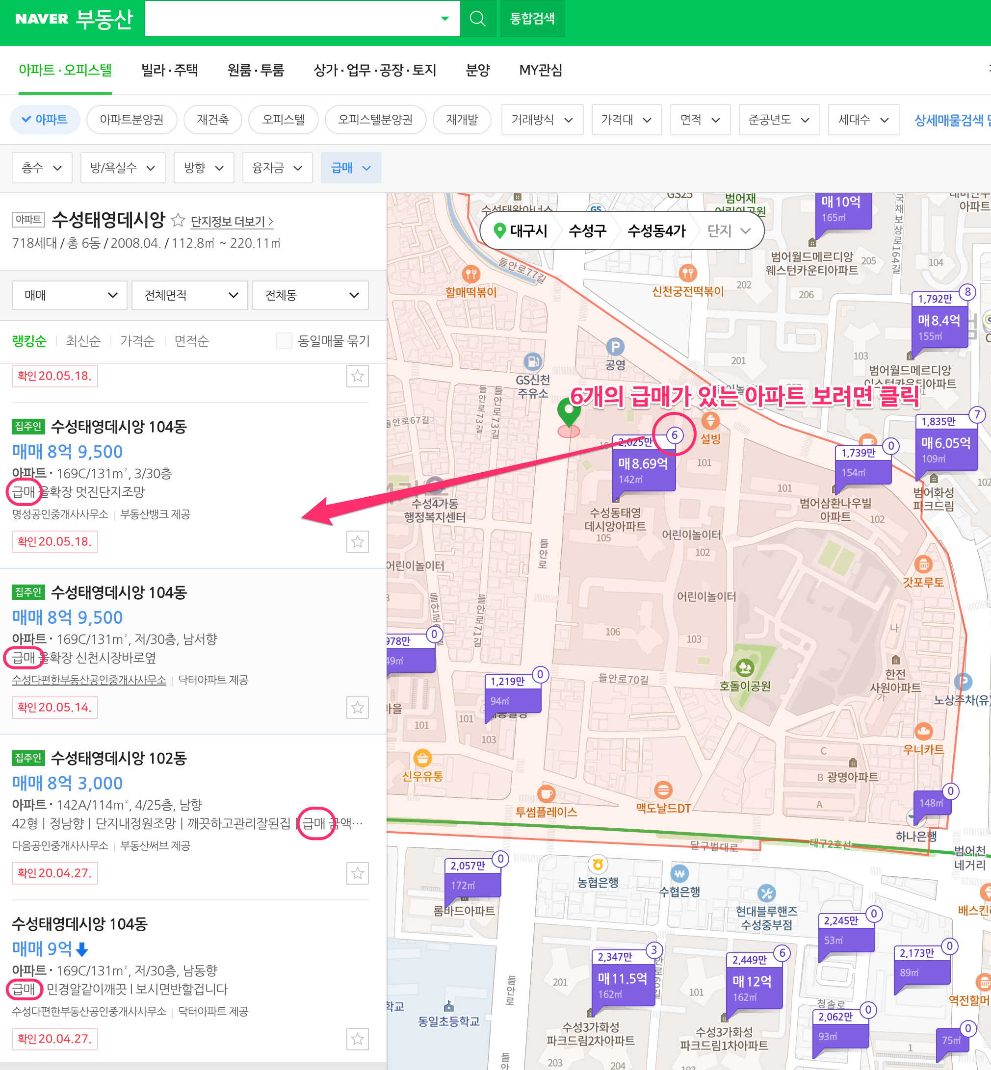 온라인으로 부동산 급매를 알아보려면 네이버 부동산에 들어가 수동으로 일일이 단지를 찍어보는 수밖에 없습니다.물론 네이버 부동산에서 아래와 같이 필터링을 하면 작업이 쉬워지겠지만