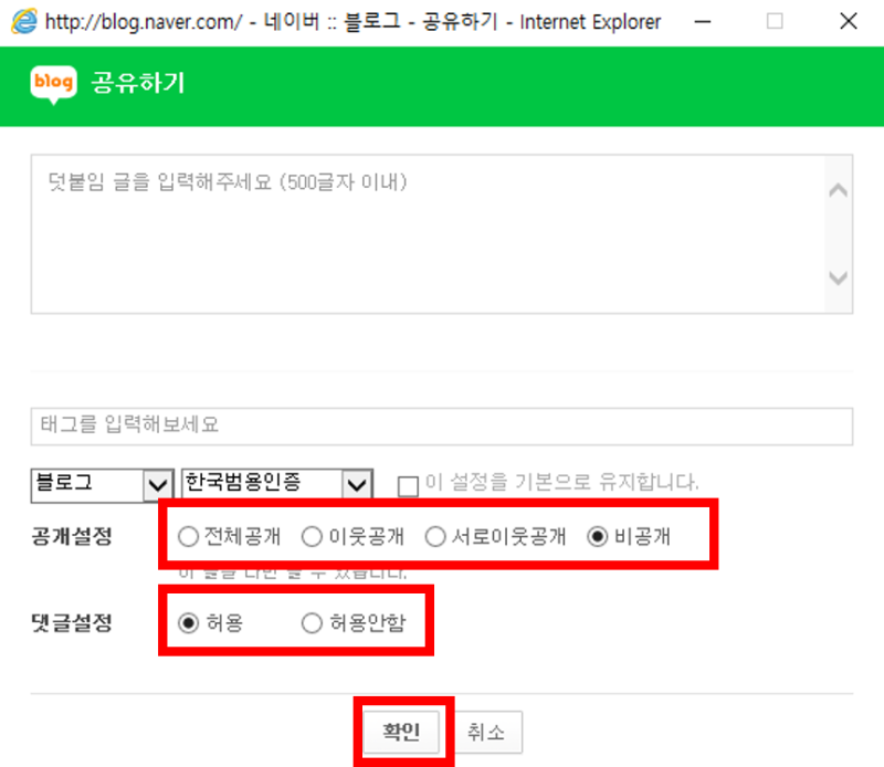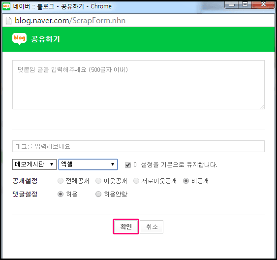 글 하단에 블로그 아이콘을 선택하면 팝업창이 뜨고 몇 가지 설정을 할 수 있습니다.코멘트를 작성하여 해당 스크랩에 대한 설명을 덧붙일 수 있으며,
