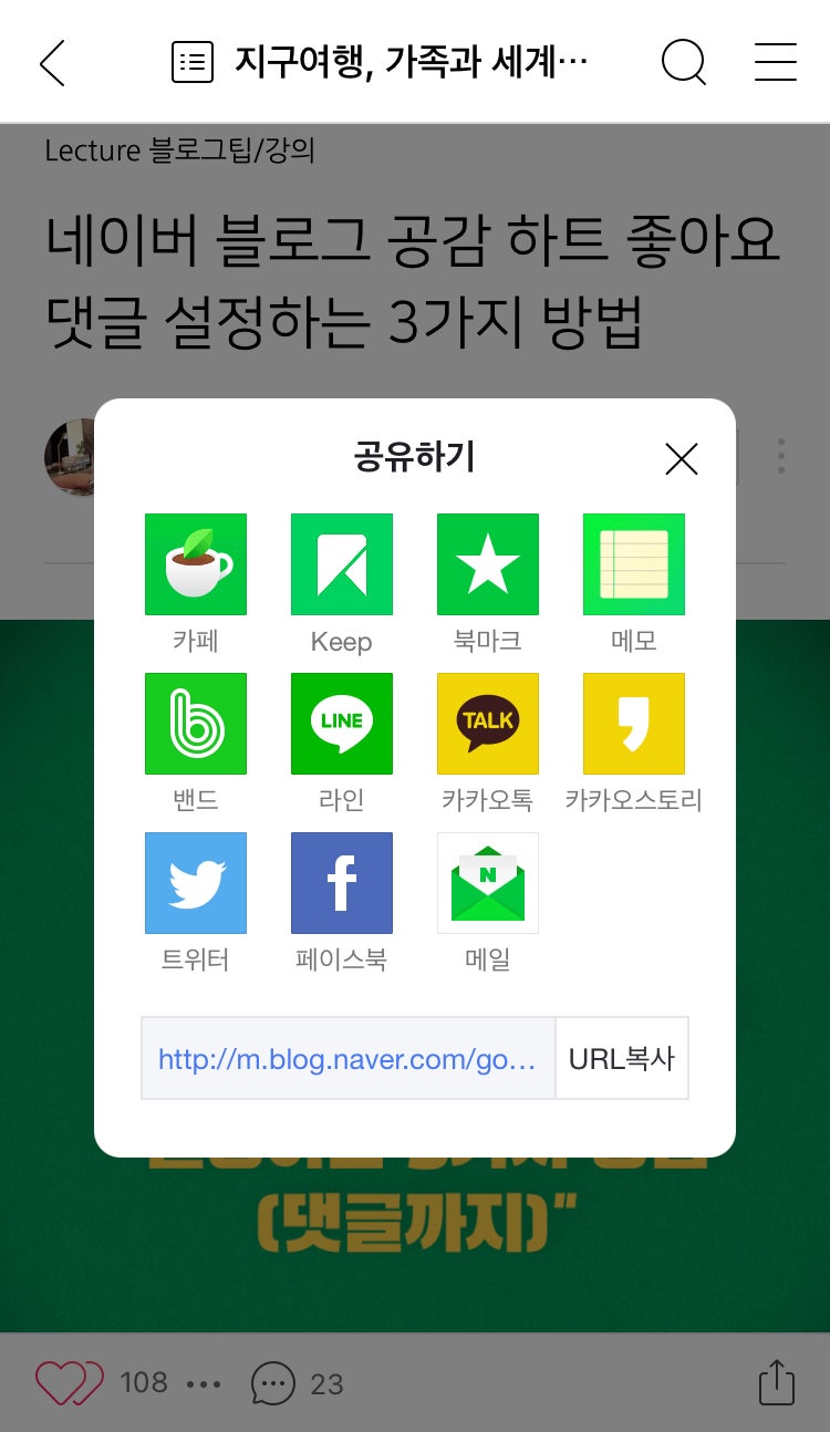 스마트폰으로 스크랩하는 방법도 동일하지만 포스팅을 열고 오른쪽 하단의 공유 버튼을 눌러 블로그 아이콘을 선택하고 PC와 동일하게 입력하면 됩니다.
