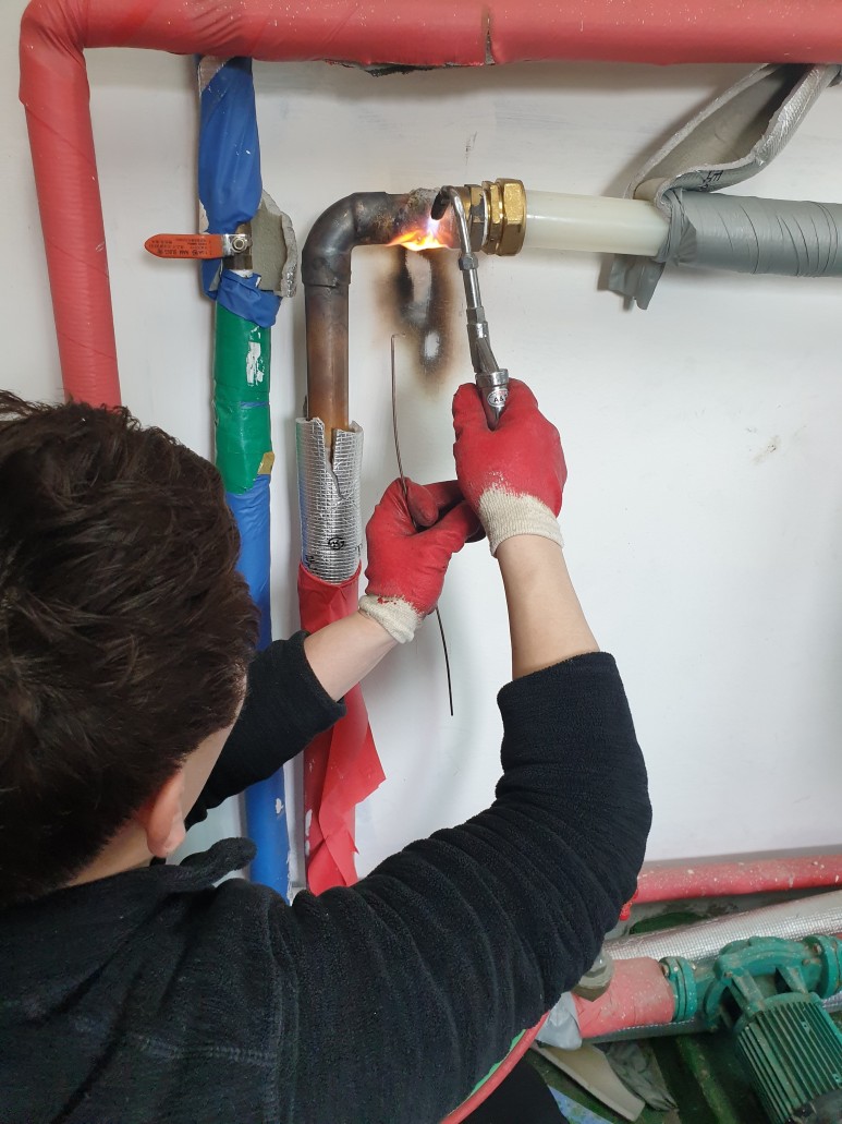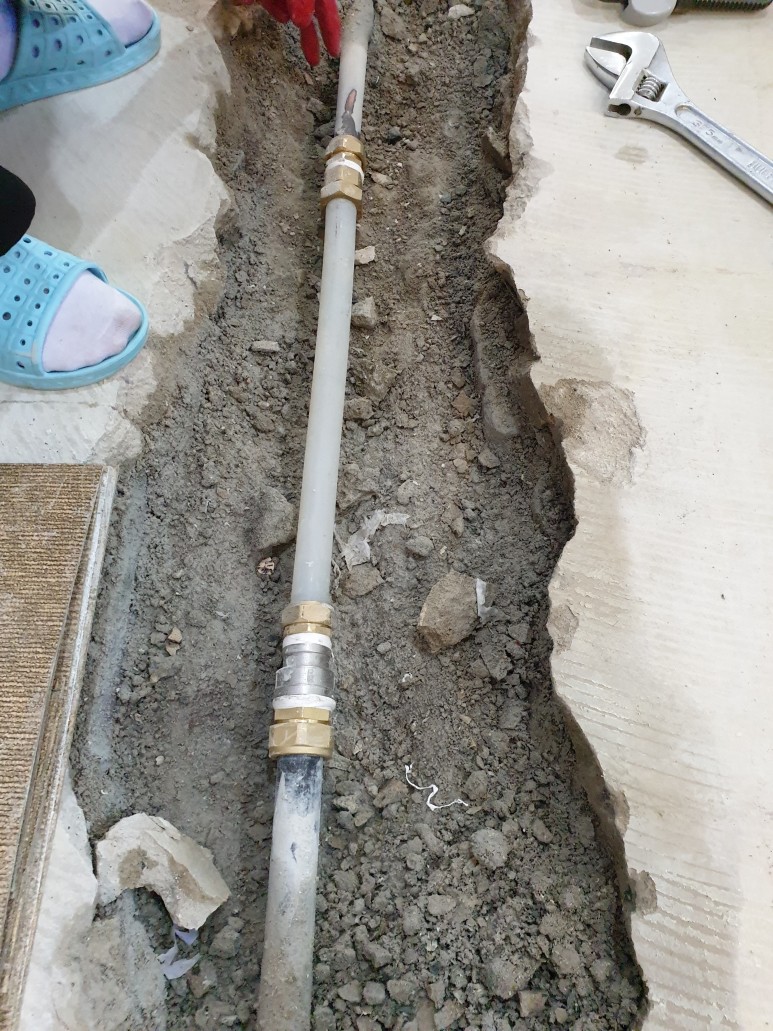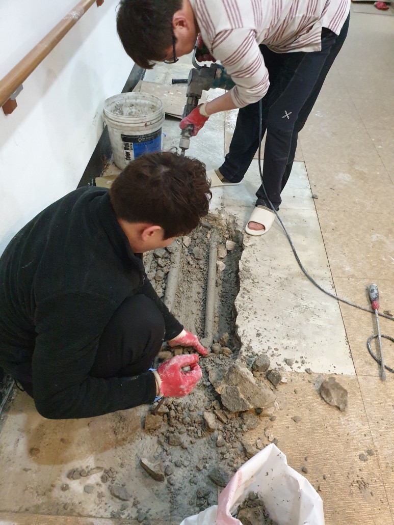 위 사진은 배관교환 및 보수장면입니다.배관은 동배관에서 XL배관으로 교환하여 진행하였습니다.XL 배관은 가장 많이 사용되는 배관으로 열수축 팽창에 내구성이 매우 강하며 땅속에 묻히면 30년 이상 부식없이 사용할 수 있는 배관이므로 교체하고 배관교체후 다시 한번 가압테스트를 하여 보수가 잘 되었는지 확인하였습니다.그리고 바닥에 시멘트를 넣고 바닥 미장 마무리를 하고 최종 마무리를 했습니다.