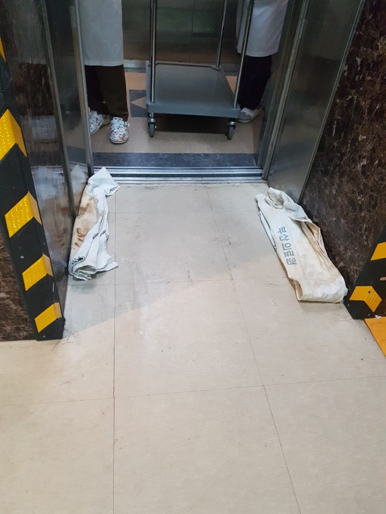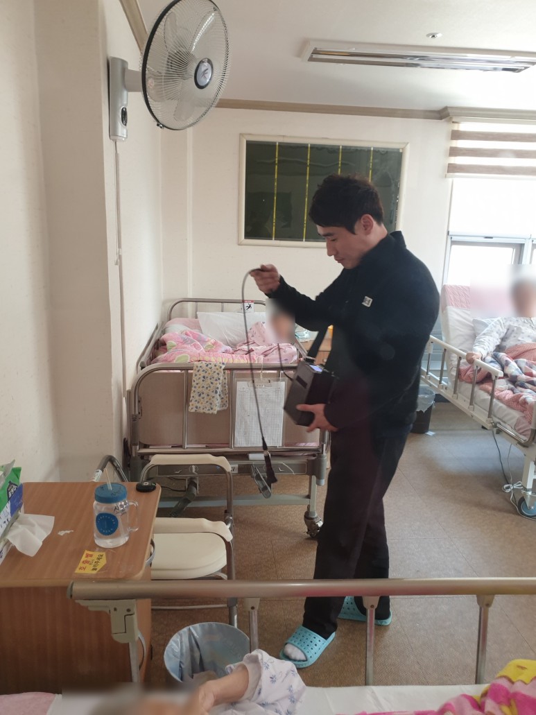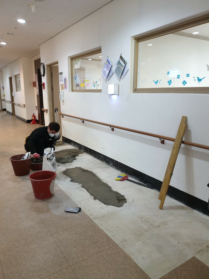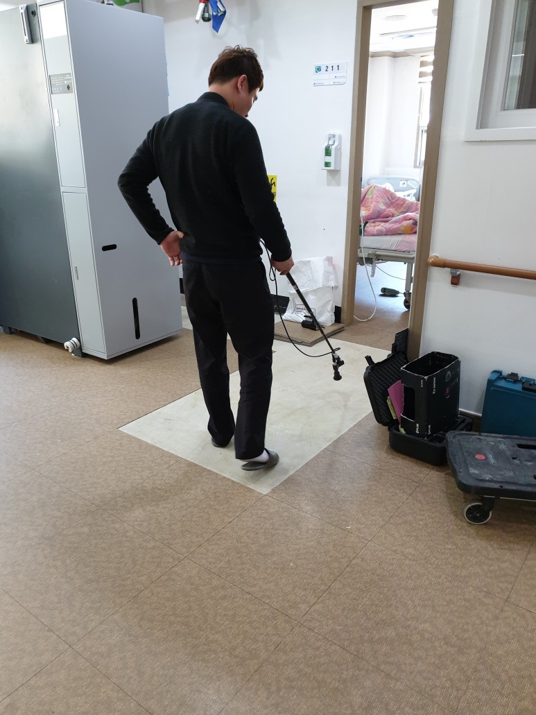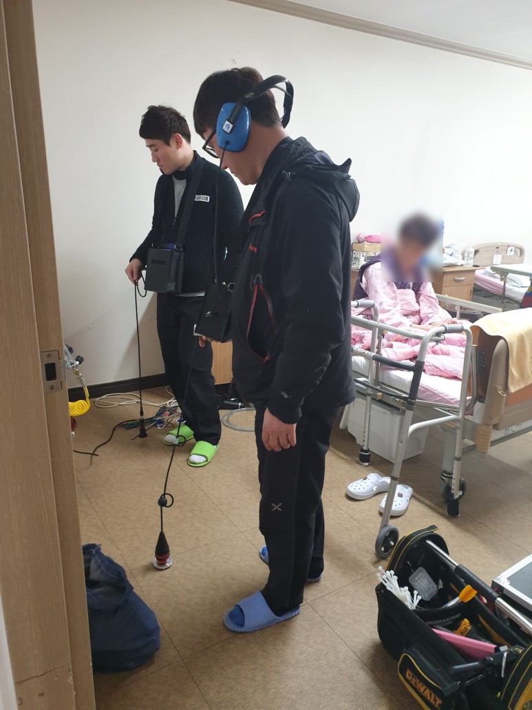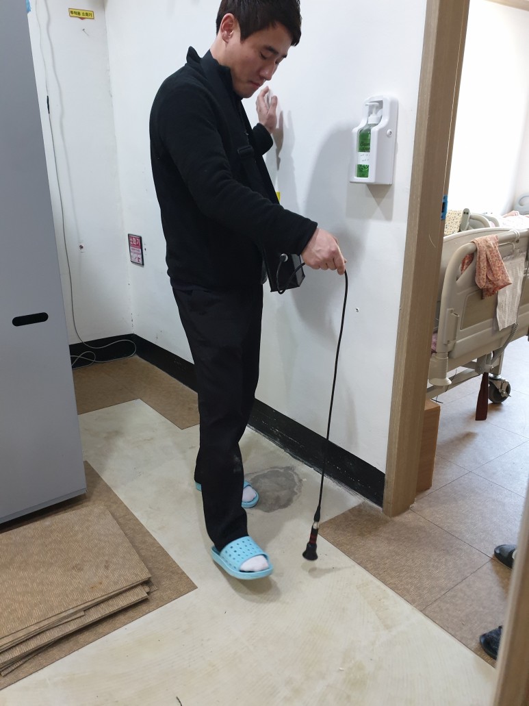 공사내역을 보면 욕실방수공사 4회, 창틀코킹(창문실리콘처리), 옥상우레탄방수공사, 수도배관교체공사, 하수배관교체공사, 외벽방수공사를 포함하지 않은 공사는 없었습니다.원장님은 몇 년째 건물의 누수를 회수하지 못해 큰일이라고 하소연하며 누수만 처리해 달라고 부탁했습니다. 병원의 특성상 환자분들이 오셔서 누수탐지에 상당한 난항이 예상되었습니다. 특히 요양병원이다 보니 어르신들이 오셔서 많은 면회객들이 다니는 시기에 공사 진행이 무척 힘들었습니다.