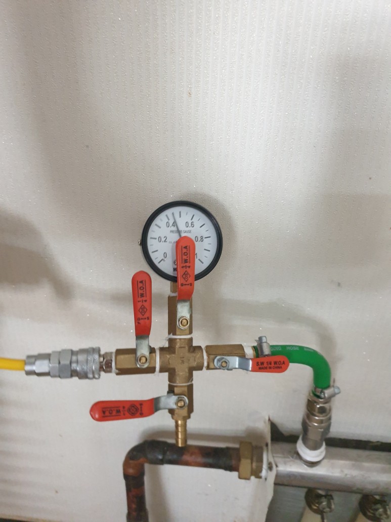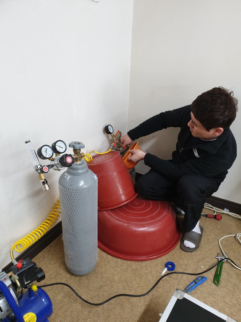 위 사진은 냉수, 온수, 난방수의 모든 배관에 컴프레서를 이용하여 가압력을 가하여 어느 배관에서 누수가 진행되고 있는지 검사하는 장면입니다.일반적으로 가장 고온의 물이 통과하는 온수 배관에 먼저 가압 테스트를 실시합니다.온수배관에 결함이 많이 발생하는 이유는 수온이 70~80도의 온도를 가진 물이 통과하면 배관이 온도에 따라 수축과 팽창이 진행돼 가장 먼저 손상을 받기 때문입니다. 그러나 난방배관의 경우 수온이 50~60도씨밖에 되지 않아 비교적 누수가 적은 편입니다.1차 온수가압 테스트를 했더니 5킬로그램의 압력이 서서히 내려가는 것을 확인했습니다.다행히 주변에서 압력이 새는 소리가 들려 찾아보니 바로 옆 배관 연결부에서 압력이 새고 있어 용접을 했습니다.