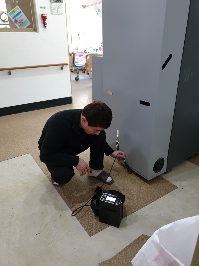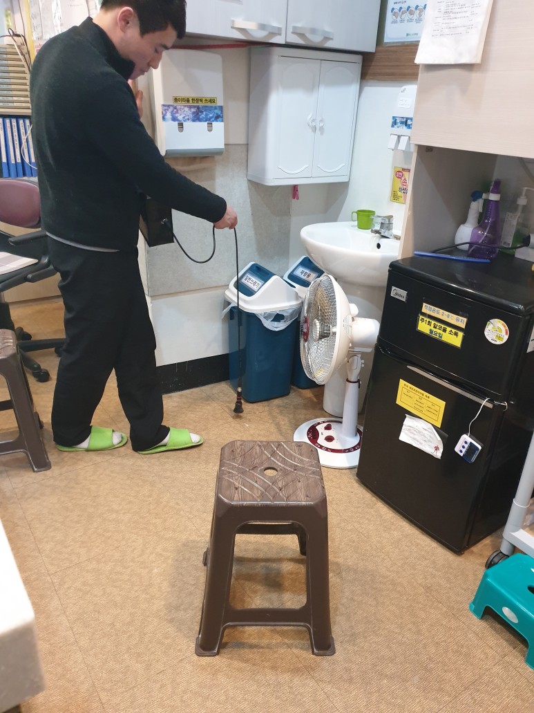 위 사진은 가스식 탐지기를 이용해 화장실, 병실, 안내데스크 곳곳을 돌아다니며 가스가 감지되는 곳이 없는지 샅샅이 뒤집니다. 혼합가스가 한 번 튀면 상당한 시간이 지난 후에 다시 감지할 수 있으므로 4인 1조가 되어 신속하게 대응합니다.