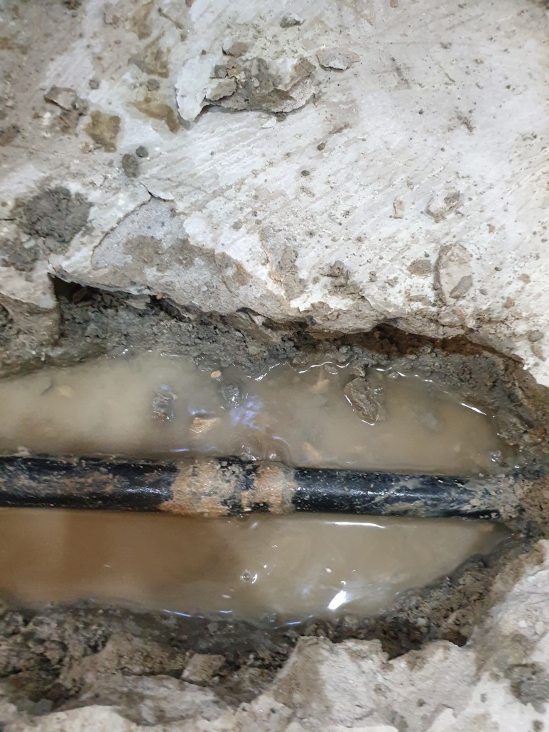 위 사진은 정확한 누수지점을 파악하고 바닥을 파쇄하고 있습니다보시다시피 난방배관 32mm에 균열이 생기고 비누거품이 올라오는 것을 볼 수 있습니다.현재 난방배관의 재질이 동일배관인데 이동배관은 온도변화에 민감하고 간헐적으로 누수가 발생하여 누수지점 추적이 상당히 어려운 배관입니다.