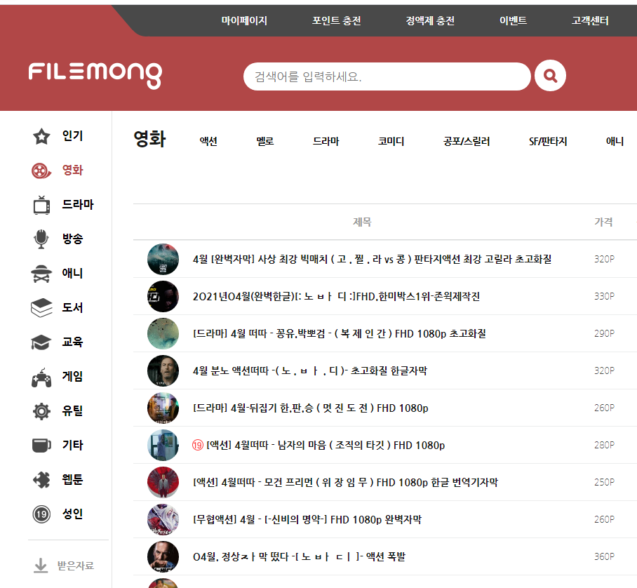 여러분! 요즘 집에서 볼 만한 영화가 뭐가 있는지 찾고 있어요 제가 완전히 편하게 이용할 수 있는 방법이 있으니 알려드릴게요. 요즘에는 바로 볼 수 있게 휴대폰 서비스가 아주 좋아요. 그래서 파일몬이라는 곳이 있어요. 여기서 대부분의 자료는 다 받아볼 수 있는 곳입니다.불편 따위는 전혀 없을 겁니다.