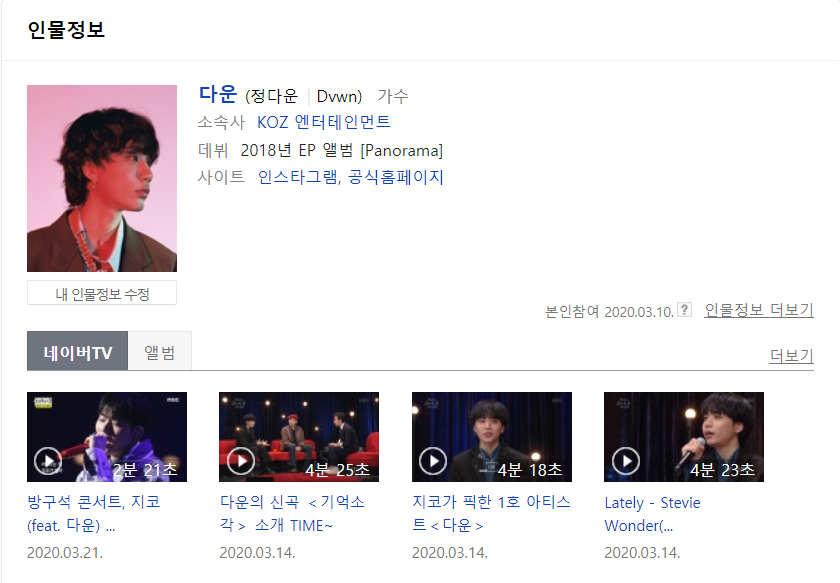 본인참여 2020.03.10. 도움말 내 인물정보 수정다운(정다은,Dvwn) 가수 소속사 KOZ엔터테인먼트 데뷔 2018년 EP앨범 [Panorama] 사이트 인스타그램, 공식 홈페이지 전체 작품활동 앨범 4건 앨범 4건 새벽제세동 Vol.3 다운 2020.06.10 새벽제세동 Vol.2 다운 2020.03.11 새벽제세동 Vol.1 다운 2019.12.16 Panorama 다운 2018.11.21 앨범 상세보기 pearch. naver.com 본명은 Dvwn ‘새벽제세동 Vol.3 다운’으로, D. A는 왜 뒤집었어? 패딩이 흔해서 더 독특하게 보이고 싶어서 뒤집었나?아무튼 이름은 정말 예쁜데 활동명이 좀… 찾기가 힘들어. 뭐 검색하면 다운, 다운점퍼 이런 걸로 곡명이랑 검색해야 진짜 볼 수 있어… 네이버에 다운 검색하면 나오는데… 프로필 외에 볼 수 있는 뉴스가 없어. 근데 프로필에도 아무것도 없어 하지만 본명이기도 하고 활동명의 의미가 좋아. 새벽 감성과 정말 딱 맞는 사람, 그리고 성까지 착한 본인! 서칭 힘든 것 빼고는 다 좋아