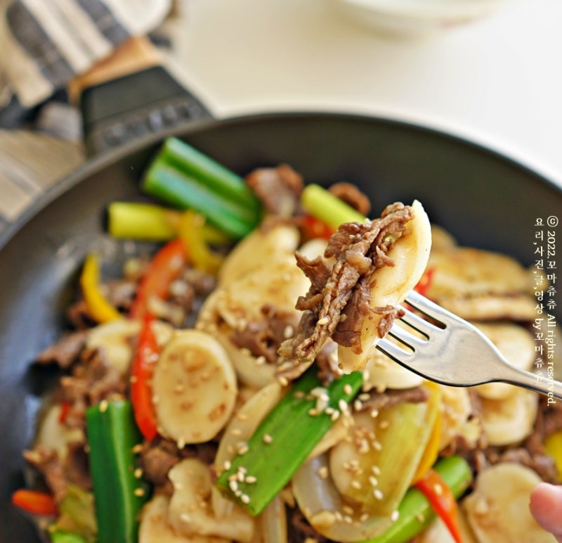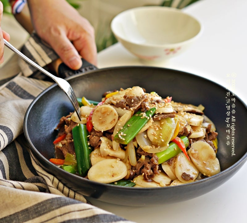 프라이팬에 식용유 2스푼 넣어요. 고기부터 볶아줘요. 고기 색깔이 전체적으로 바뀌면떡 넣어주세요. 그리고 기름 코팅 한번 해드릴게요. 너무 오래 볶지 마세요. 한번 섞어준다는 느낌!준비한 야채를 넣어주세요. 그리고 양념장도 들어갑니다. 양념장 다 부어주세요. 센 불에서 조리를 합니다.끓기 시작하면 중불로 내리고 야채도 익힙니다. 맛있게 전체적으로 볶아줍니다.자, 마무리가 될 무렵에 물엿 1스푼으로 윤기를 더해줍니다. 물엿 대신 올리고당을 넣어도 됩니다. 설탕과는 또 다른 단맛이죠.물엿이 들어가서 살짝 다시 볶아주면 떡국 궁중떡볶이 레시피 완성이에요!아이들이 엄지손가락을 세워주는 황금 레시피 이웃들도 만들어봐요~ 단짠 매력에 푹 빠질 거예요.남은 떡국 있으면 꾹꾹 눌러보세요. 그럼 즐거운 하루 보내세요. 🙂 요리, 사진, 꼬마 츄블펌, 재편집은 불가합니다.