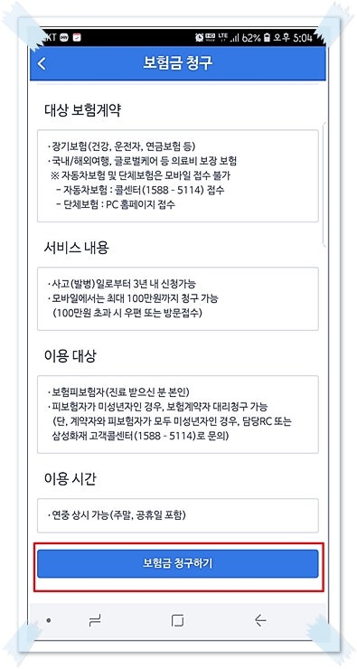 보험금 청구 절차와 안내사항을 읽어보신 후 모바일 보험금 청구를 눌러주세요.