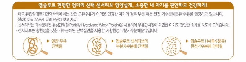 간단히 설명하자면 부분 가수분해는 우유 단백질을 부분적으로 가수분해한 제품으로 알레르기가 있는 가족이나 단백질에 민감한 아기의 편안한 소화를 돕는 역할을 해주는 조제식으로 앱솔루트 센서티브가 대표적입니다.