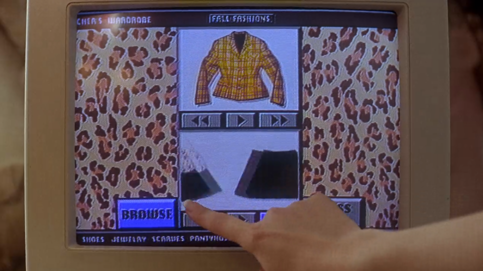 넷플릭스 하이틴 영화 ‘크루리스’ 속 컴퓨터로 옷을 고르는 모습ㅣ넷플릭스 캡처, 특히 주인공 셰어 의상은 정말 지금 봐도 거의 촌스럽지 않아요!
