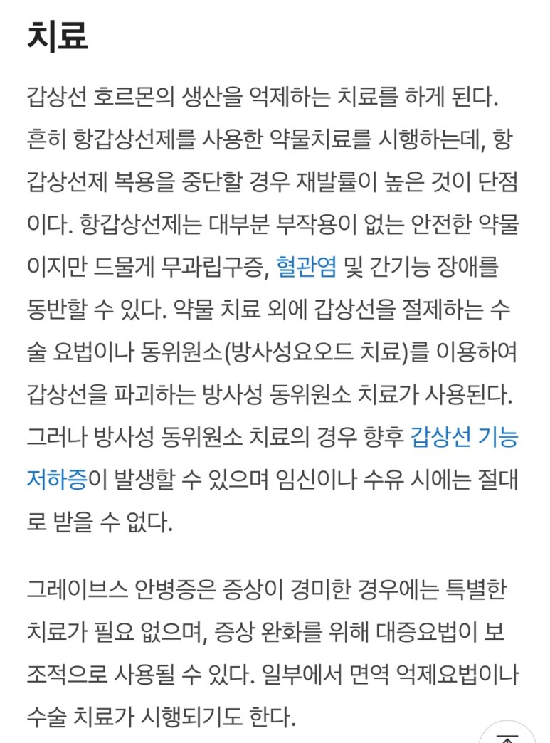 갑상선 항진증을 치료하기 위해서는 대부분 약물 치료가 이루어집니다.약만 먹고 약으로만 조절해요.