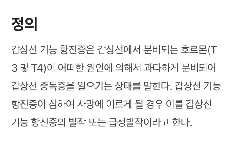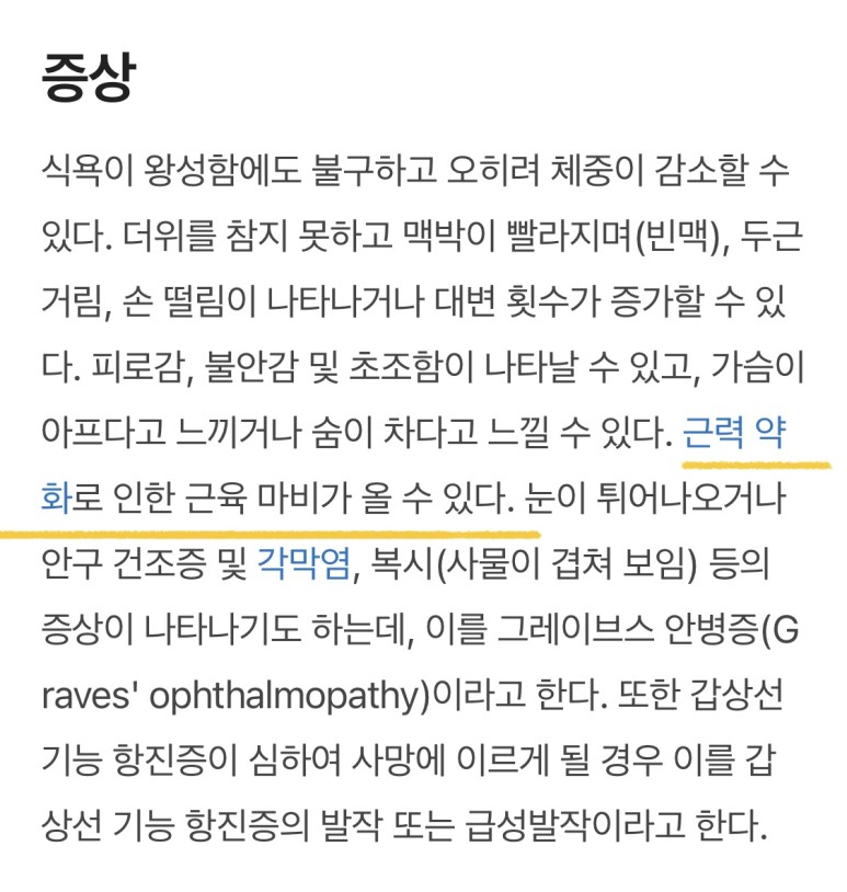 갑상선항진증에는 대표적으로 눈이 튀어나오는 증상만 알고 있는 분들이 많은데 근육마비 증상이 발생하기도 합니다. 근데 무서운 건…그 근력 저하가 다리가 아니라 심장 쪽으로 오시는 분들은 심장 근육이 마비되어 사망할 수도 있다고 합니다. 어떻게 보면 저는 운이 좋았습니다.