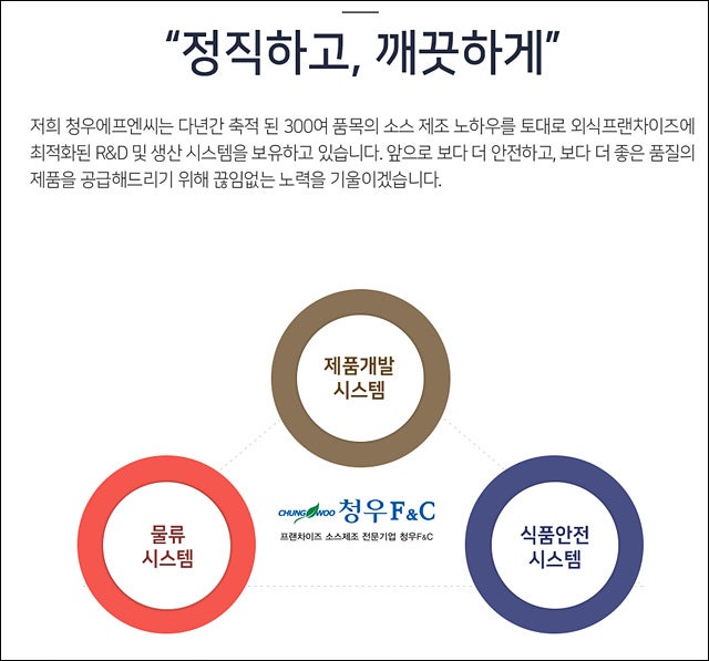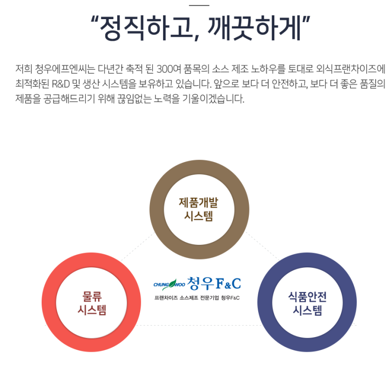 그런데 소스 제조라는 것은 배합에 따라서 맛의 편차가 크기 때문에 누구와 함께 하느냐가 앞으로의 미래를 결정할 수 있습니다. 그래서 우리는 우리와 함께 미래를 만들어 갈 것을 추천합니다. 우리는 오랜 세월 축적된 300여 품목의 소스 제조 노하우를 바탕으로 외식 프랜차이즈에 최적화된 R&D 생산 시스템을 보유하여 안전하고 좋은 품질의 제품을 공급할 수 있습니다.