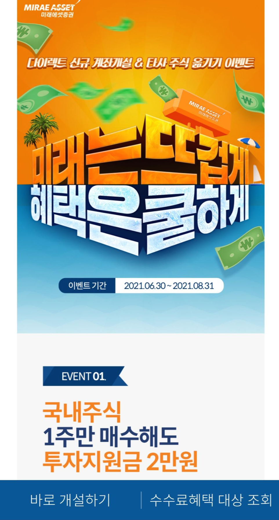 증권사에서 신규 고객을 대상으로 고객 유치를 목적으로 개설 이벤트를 진행하고 있다.주식투자용 주계좌는 모두 갖고 있지만 다른 증권사 계좌는 보통 개설하지 않지만 공모주 청약을 위해 깡통계좌를 만들어 청약용으로 활용하는 분들이 많다.나도 오늘 미래에셋증권 주식계좌를 개설했어.증권사마다 이벤트를 보면서 개설하면 축하금을 주는 경우가 많다.공모주 청약을 위해 오늘 처음으로 미래에셋증권 계좌를 만들었다.미래에셋증권 이벤트에 신규 고객 대상 최초로 주식계좌를 개설하면 축하금 2만원 이벤트를 진행하고 있었다.