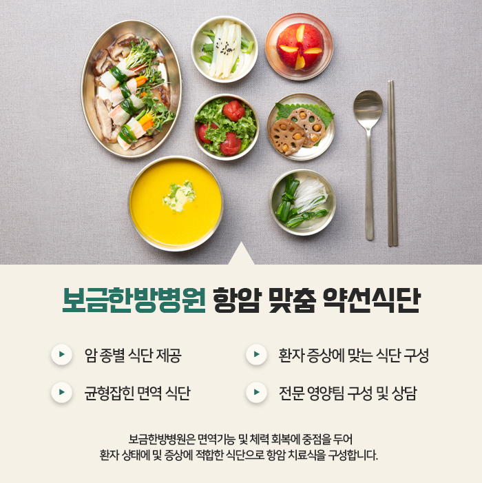 또한 한․서양 협진시스템을 구축한 서울암요양병원인 보금한방병원에서는 갑상선암 환자들을 위해 입원시 전문 영양팀과 정밀한 상담을 통해 환자의 증상 및 체질을 파악하고 개개인에게 최선을 다하고 있습니다. 서울암요양병원인 본원의 항암맞춤약선 메뉴는 한의학과 영양학을 융합하여 섭취 효능과 목적을 우선하는 균형 잡힌 면역약선 메뉴를 선보이고 있습니다.