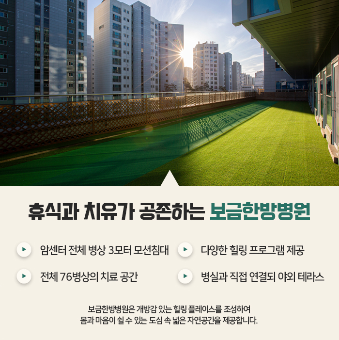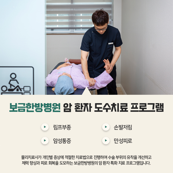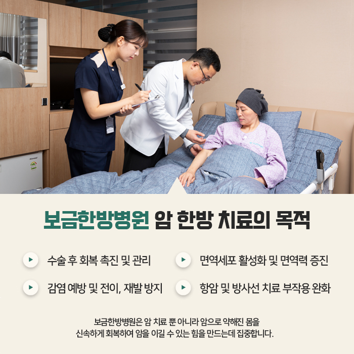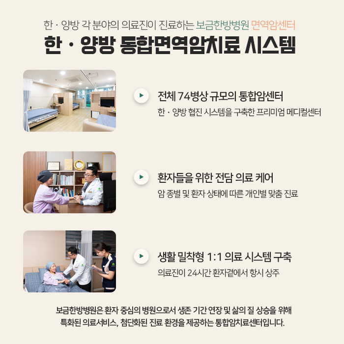 갑상선암 림프선전 및 재발방지를 위해 서울암요양병원인 보금한방병원에서는 발암환경으로 조성된 신체의 무너진 면역감시시스템 재건에 도움을 주고 치료성적을 향상시키는 통합면역암치료를 시행하고 있습니다. 다양한 경험을 가진 한방의료진과 한방의료진의 체계적인 협진을 통해 갑상선암 환자의 체질과 병기, 증상 등을 보다 면밀히 파악하고 고려하여 적절한 치료와 처방을 제공하고 있습니다.
