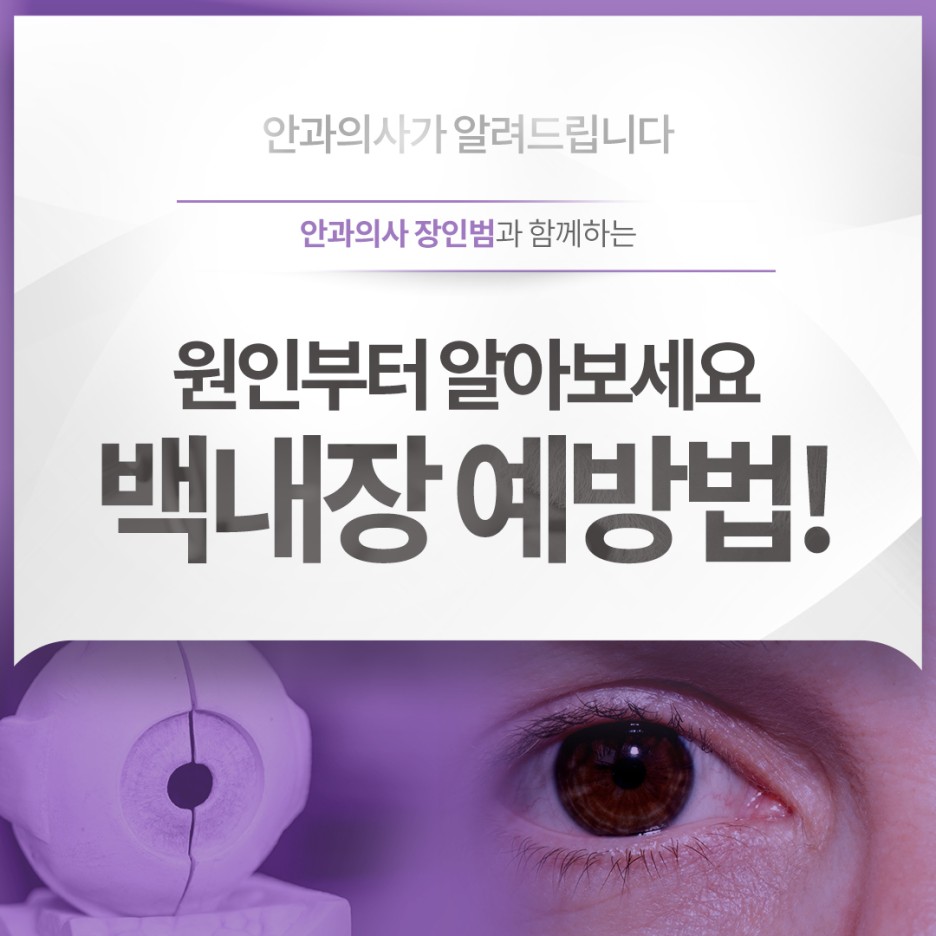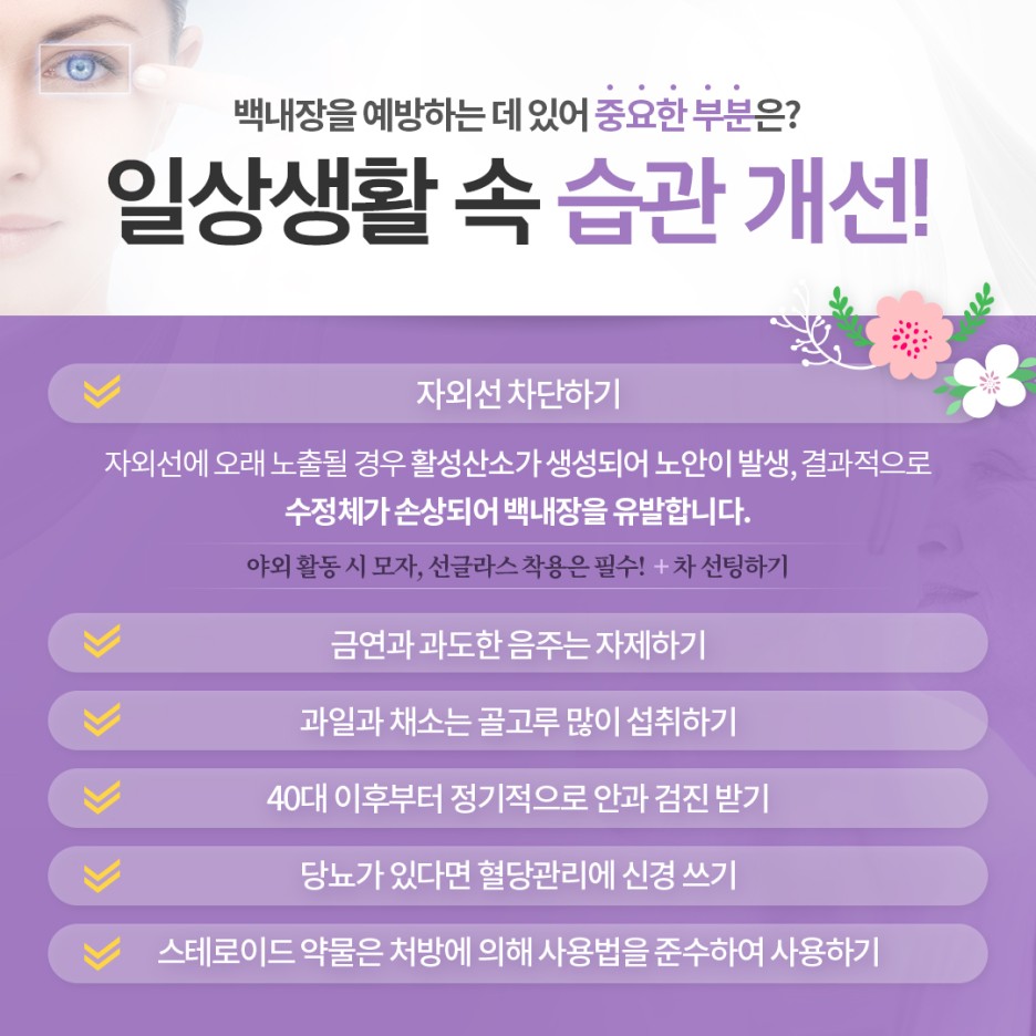 백내장은 자칫 실명으로까지 이어질 수 있는 안질환인 만큼 평소 일상생활 속 습관을 개선하고 예방하는 것이 중요합니다.