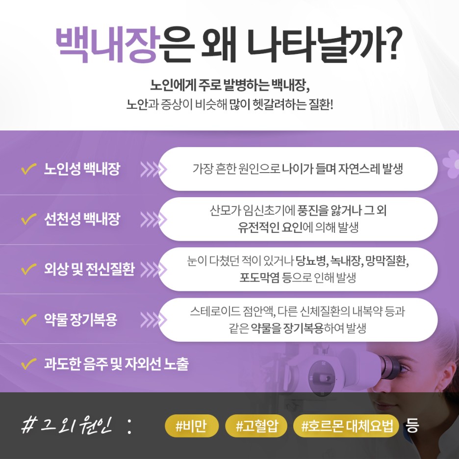 백내장은 과거에는 노화로 인해 나타나는 안질환으로 주로 노인들에게 발병하는 질환이었으나 최근에는 발생 시기가 빨라진 만큼 다양한 백내장의 종류와 원인에 대해 확인해 볼 필요가 있습니다.✔ 노인성 백내장의 가장 일반적인 백내장의 종류 중 하나로 발생하는 원인은 앞서 설명한 바와 같이 나이가 들면서 신체노화가 시작되어 자연스럽게 발생하게 됩니다.
