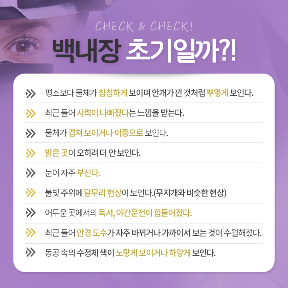 만약 최근 시력이 저하되거나 다음과 같은 증상을 느낀다면 백내장 초기 증상일 수 있으므로 자세한 진단을 위해 가까운 안과를 방문하여 전문의와 상담 및 검사를 받아보시기 바랍니다.✔백내장 초기증상