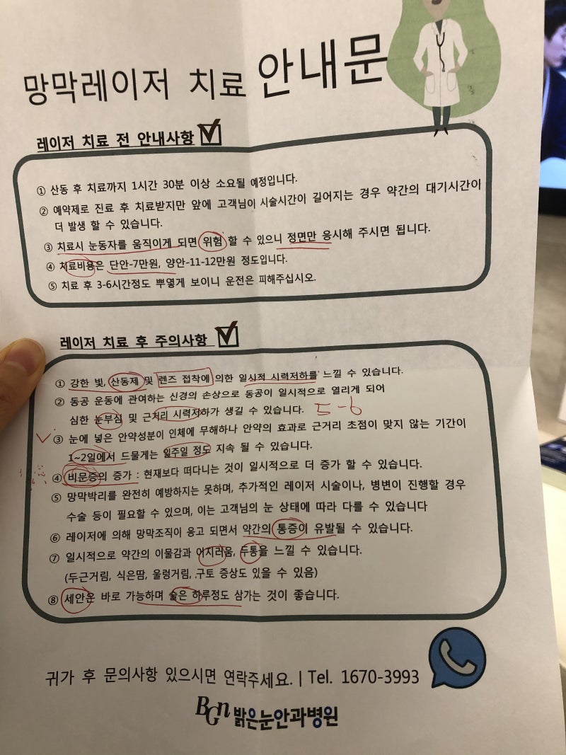 생각보다 많은 사람들이 이 병을 인지하지 못하는 경우가 많다고 한다.검은 점이나 아지랑이가 떠 있거나 눈을 감았을 때 빛이 반짝이고 시력이 심하게 고도 근시하는 분들은 꼭 안과 정기검진을 해보도록 방치하면 실명할 수도 있습니다.나도 비문증이 전혀 불편하지 않을 정도로 약했지만 너무 고도근시로 정기검진을 갔을 때 검사 결과 망막에 구멍이 있어 꾸준히 레이저 치료를 받고 있다.하지만 마지막으로 병원에 간 것을 알고 보니 2019년 말이었다.ㅋㅋㅋ약간 비모기 증상이 아른거리는 것 같아서 오랜만에 병원 검사를 다녀왔다.