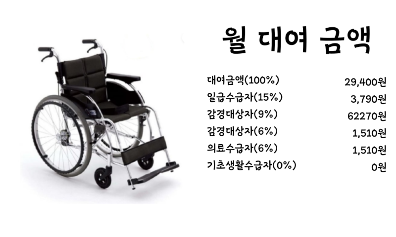 장기요양등급으로 대여할 경우 휠체어 대여료는 본인부담률에 따라 조금씩 다릅니다.”15%는 대략 5천원~4천원” “9%는 3천원~2천원” “6%는 1천원대” 기초생활수급자라면 본인부담률 0%로 부담하는 금액 없이 렌탈이 가능합니다 ^^