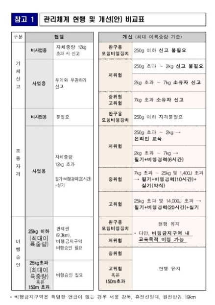 현재 자제 중량이 12kg을 초과하는 드론은 총 4분류 (위험군에 따라) 세분화되었습니다.