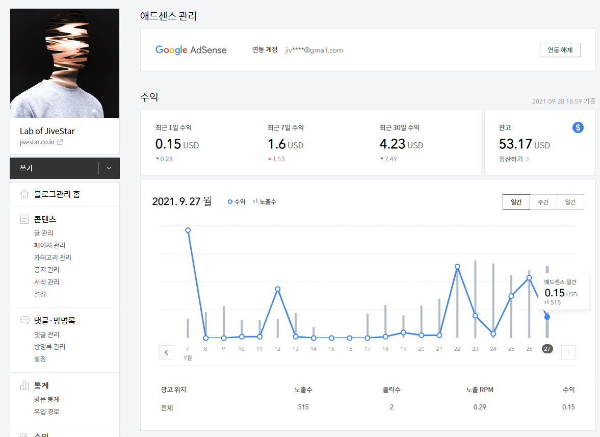 티스토리는 작년 4월부터 시작되었으며, 6월에 애드센스의 승인을 받았습니다.