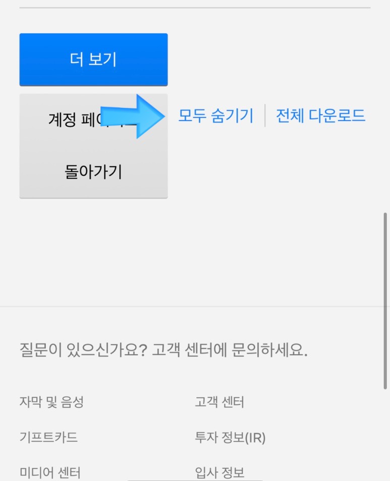 맨 아래로 내려가서 ‘모두 숨기기’를 누르면 하나하나 삭제하지 않아도 다 없어집니다. 넷플러스 앱을 사용하면서 본 영상이 무엇인지 따로 기록해 두고 싶은 경우는 「전체 다운로드」를 클릭해 보존해 주세요.