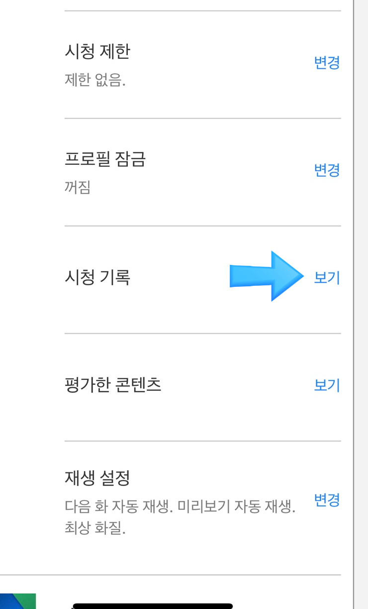 계속 내리면 이렇게 프로필이 보일 거예요. V를 눌러 시청 기록[보기]을 터치하면 최근에 시청한 기록도 볼 수 있습니다.