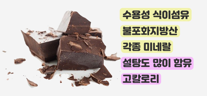 1. 영양소가 풍부하다.다크 초콜릿에는 수용성 식이섬유가 풍부해 장 건강에 좋을 뿐만 아니라 철분, 마그네슘, 구리, 망간, 칼륨, 인, 아연, 셀레늄 등 미네랄이 풍부하게 함유되어 있습니다.수용성 식이섬유는 포만감을 갖게 함으로써 식욕을 막아줍니다. 또한, 변비를 줄이고 유익한 장내세균을 늘려 과민성대장증후군 예방에도 효과가 있습니다.또한 불포화 지방산이 많은데, 그 중에서도 스테알산은 콜레스테롤을 낮추는 효과가 있습니다.다만 100g당 600kcal로 칼로리가 높은 데다 초콜릿 제조 과정에서 설탕이 들어가기 때문에 많이 먹지 않는 것이 좋습니다.