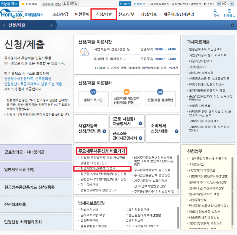 환급계좌 등록도 홈택스에서 바로 할 수 있다.홈택스 접속 후 신청/제출환급계좌 개설(변경) 신고서에 들어간다.