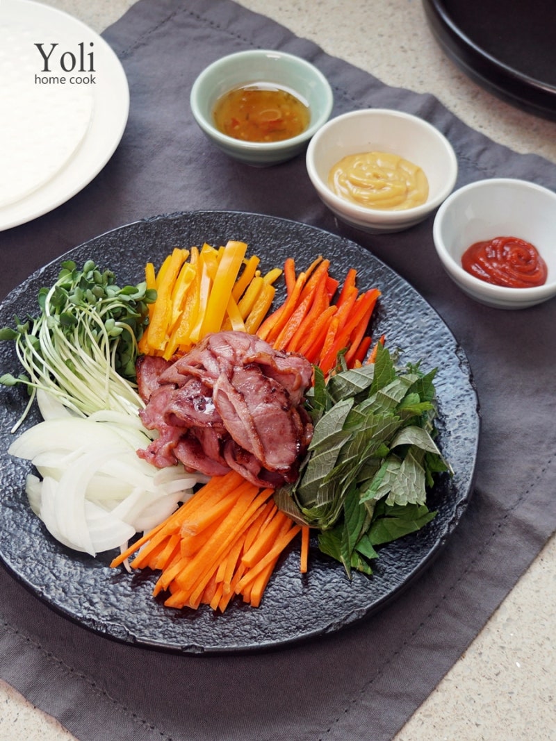 월남쌈에 생야채를 넣어 만들기 때문에 고기가 있으면 좋겠지만, 얇게 썬 삼겹살을 불고기 느낌으로 간장 양념에 볶으면 월남쌈 소스를 따로 만들지 않아도 맛있게 즐길 수 있습니다!