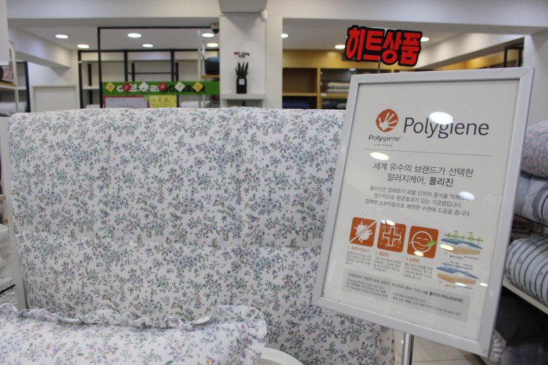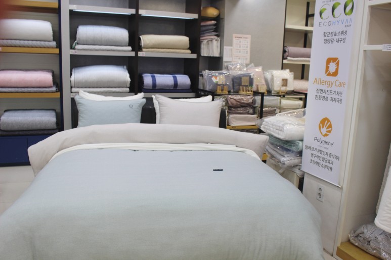 항균성, 탈취성, 청량감, 내구성, 알레르기 케어, 즉 집 먼지 진드기 차단, 친환경, 저자극성, 나아가 알레르기 유발인자의 증식 억제, 영구적인 항균 효과, 초강력 탈취 작용까지 기능성 침구였습니다.