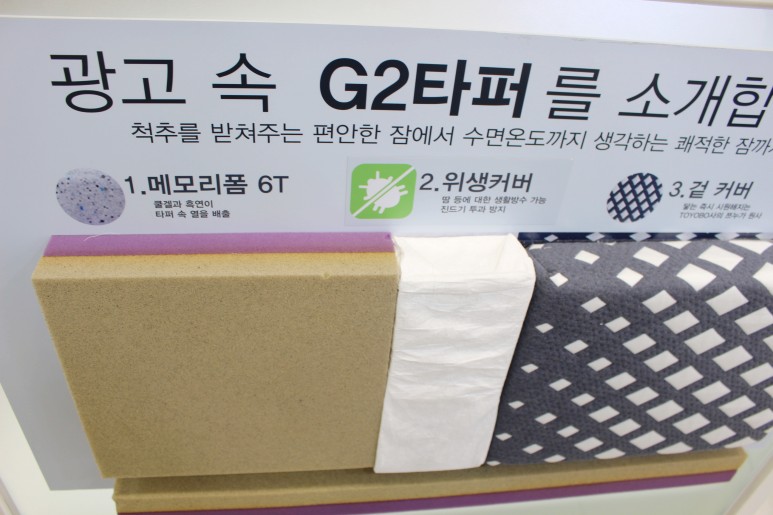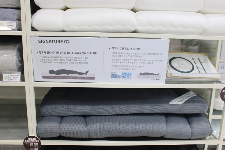시그니처 G2(시그니처 하이브리드 토퍼 화이트, 다크 그레이 색상 등이 있었습니다)는 경도와 탄성 다른 2가지 폼으로 체압 분산과 척추 지지 즉 탄성감이 뛰어난 우레탄 폼과 고밀도 메모리 폼 2중 구조로 누웠을 때 몸에 가해지는 압력을 균일하게 흡수, 분산시켜 장시간 누워 있어도 불편함 없이 몸을 전반적으로 도와줍니다.
