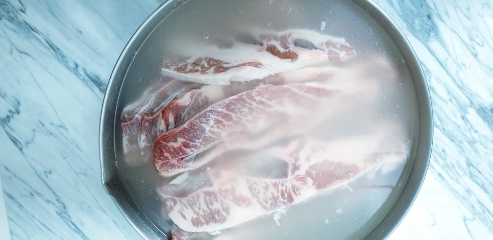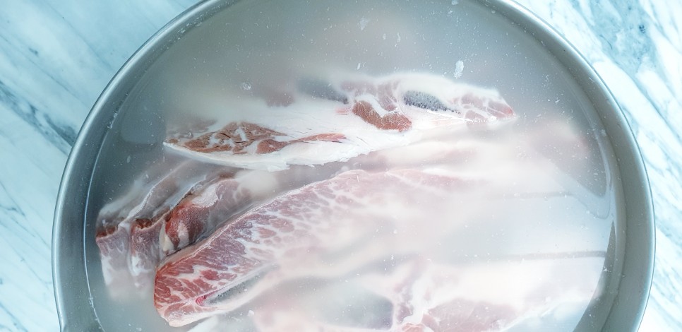 두 번째와 세 번째는 저는 쌀뜨물을 이용해서 피를 빼요이렇게 하면 냄새나 냄새가 확실히 없어져요첫 번째 쌀뜨물은 버리고, 두 번째와 세 번째 쌀뜨물을 모아 둔 후 두 번째 핏물을 뺄 때 사용합니다.한 번에 시간은 한 20분 정도 해요