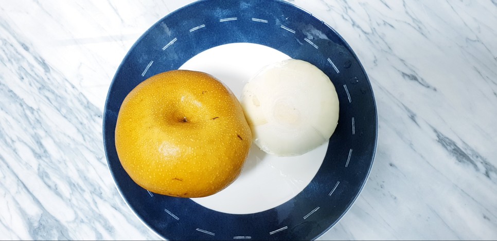그 사이에 LA 갈비구이 만드는 법으로 양념장을 만들어 볼게요저희는 너무 싱겁지도 짜지도 않은 정도로 만드는데 분량대로 만들면 간이 딱 맞았어요 먼저 배 1개랑 양파 중간 걸로 2개 정도 먼저 갈아요저는 믹서기로 아주 잘게 갈아서 준비했습니다