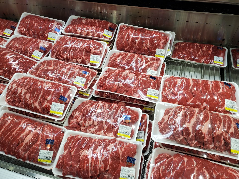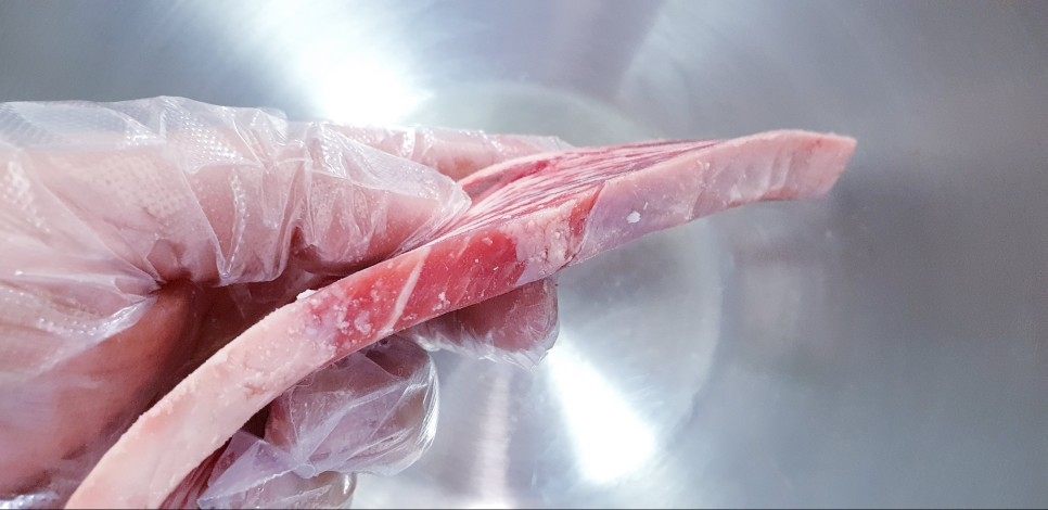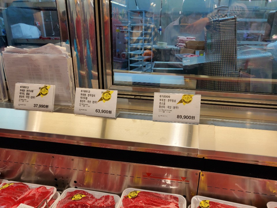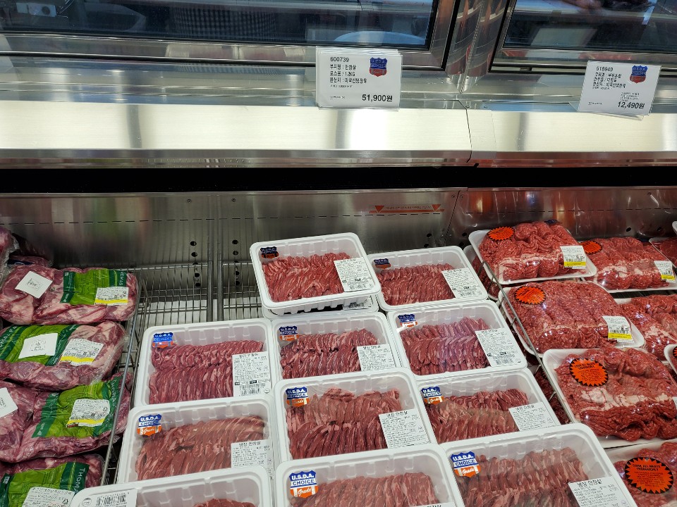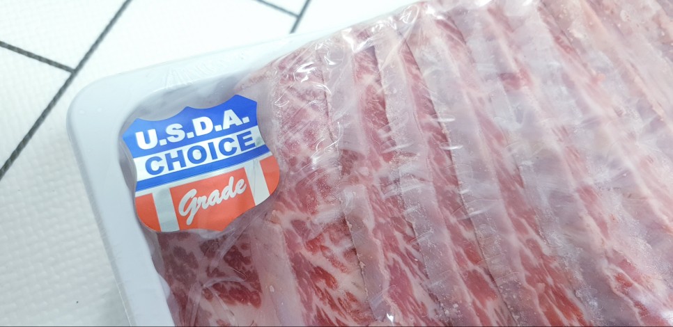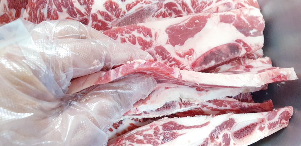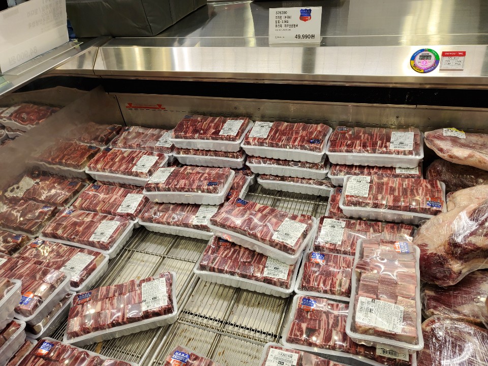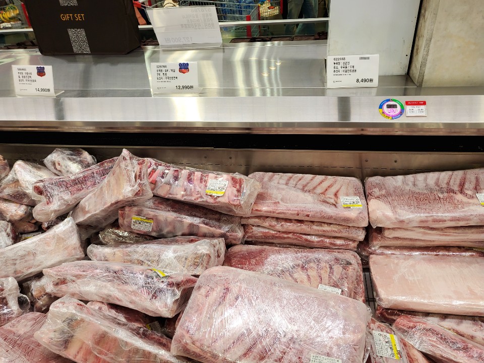 고기는 제일 윗단과 아랫단의 단과 가장 아랫단은 차이가 납니다.보기처럼 점점 지방이 많아져요.살을 좀 더 잘라내서 팔아주면 얼마나 좋을까 싶은데요.이 부분은 이마트 트레이더스의 고기와도 다르지 않습니다.보이는 부분은 좋은 것으로 하고 그 아랫부분은 육안으로 확인할 수 없기 때문에 전체 고기의 상태를 볼 수 없다는 것은 다 같습니다.