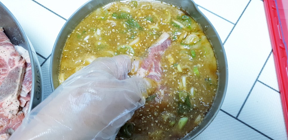 숙성이 되면 LA갈비를 하나씩 양념에 넣어서 충분히 양념이 스며들게 해줘요