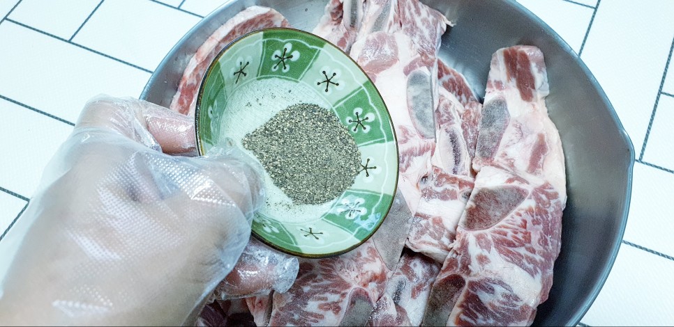 후추랑 미림, 설탕으로 일단 밑간을 해요 저는 이번에 설탕을 뺏는대요kg당 설탕 반스푼 후추 1스푼, 맛술이나 청주 1스푼 반을 넣고 주물럭거려 골고루 섞일 수 있도록 먼저 밑간을 해 줍니다.고기가 얇아지는 작업이기도 하고 맛이 잘 배도록 하는 과정입니다.