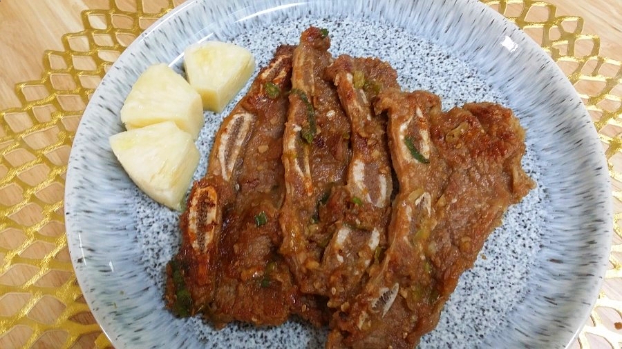 이렇게 해서 LA갈비구이 만드는 방식으로 LA갈비구이가 완성됐습니다손님 상차림이라면 예쁘게 담아내면 좋겠네요.이건 빵에 구운 LA 갈비 구이 빵에 구우면 색깔이 더 예뻐요