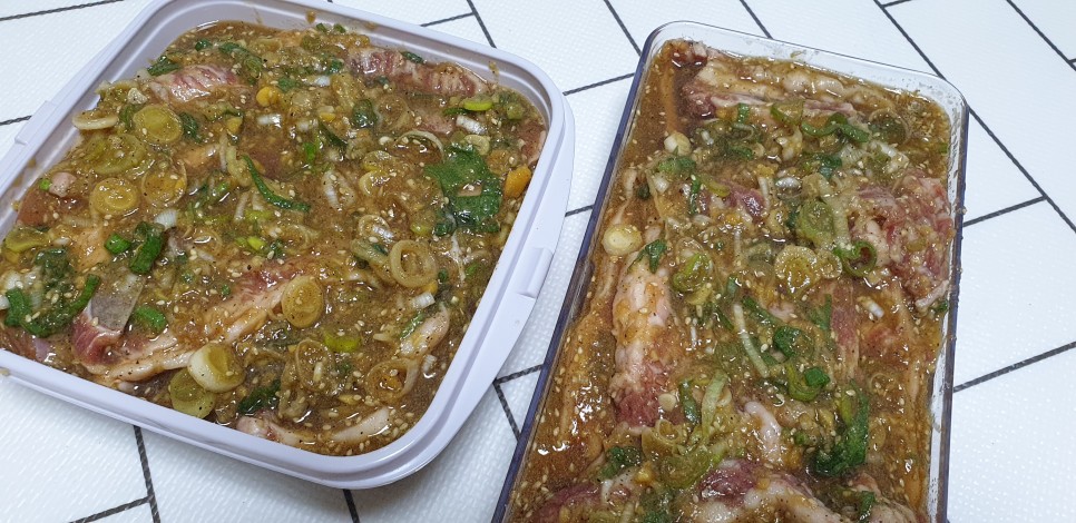 분량대로 양념장을 만들고 밑간을 한 고기는 냉장고에서 30분 정도 숙성시킨다.